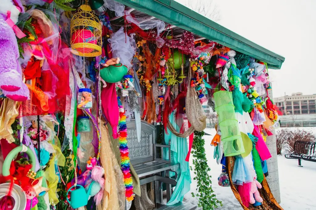 It consists of a house-like structure filled with thousands of hanging objects such as shoes, clothing, old photographs, trinkets, handwritten letters, and other items that reference ideas of home and personal memories.