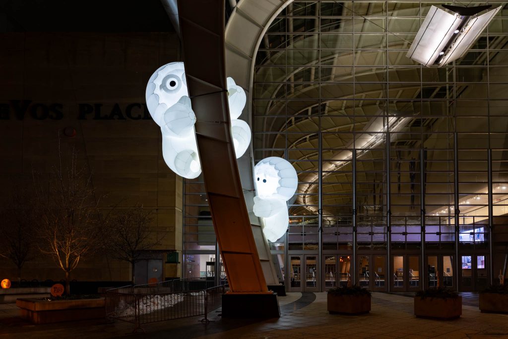 Meet the Anooki, two droll and timid figures who have lost their home! These giant, inflatable messengers commandeer urban spaces, turning Grand Rapids into their playground.