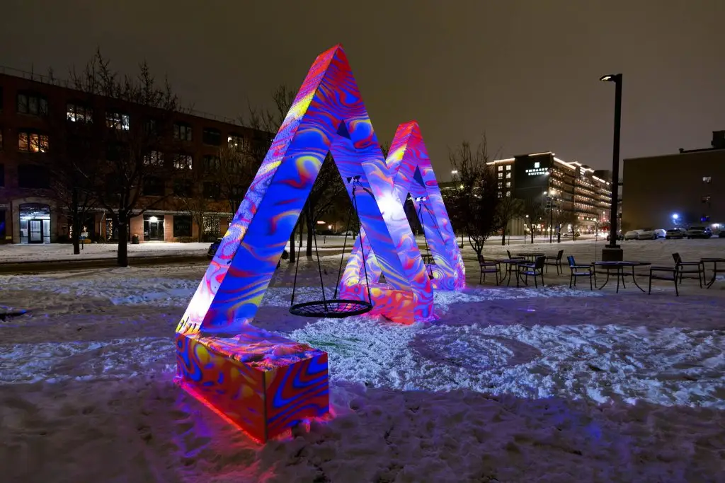 Featuring two swings and integrated benches, APOGEE invited visitors to relax and engage with the artwork. At night, the vibrant visuals came alive alongside an original synth soundtrack that heightened the sensory experience.