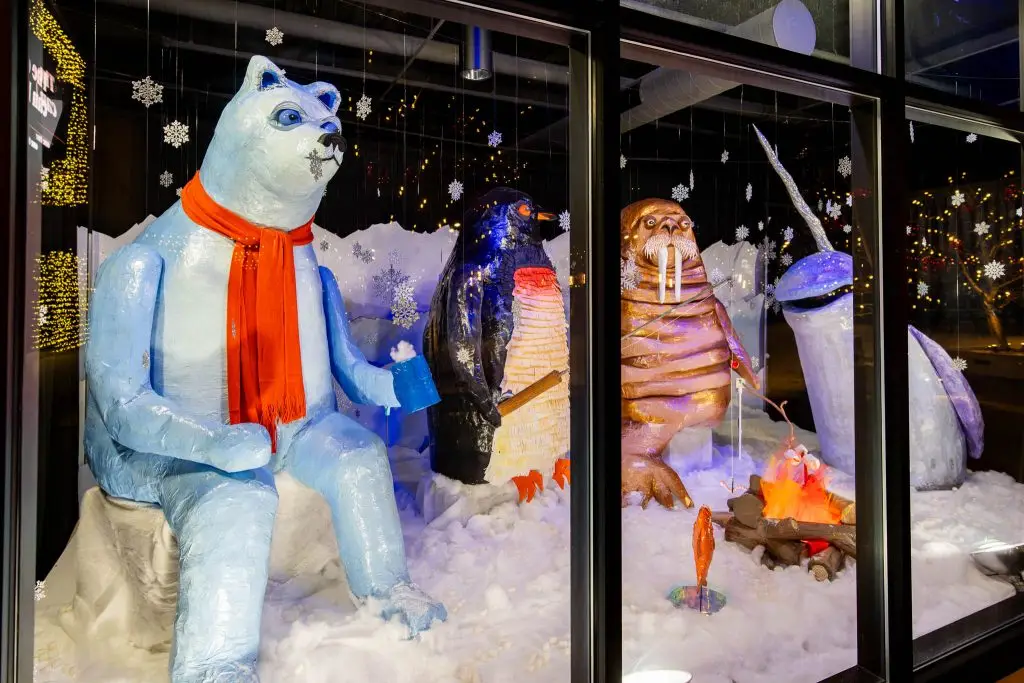 This large-scale, family-friendly paper-mâché installation celebrated the winter season with a cast of arctic animal friends enjoying seasonal activities. The mechanical set featured four animals ice fishing, sipping hot cocoa with marshmallows and warming themselves by a small bonfire.