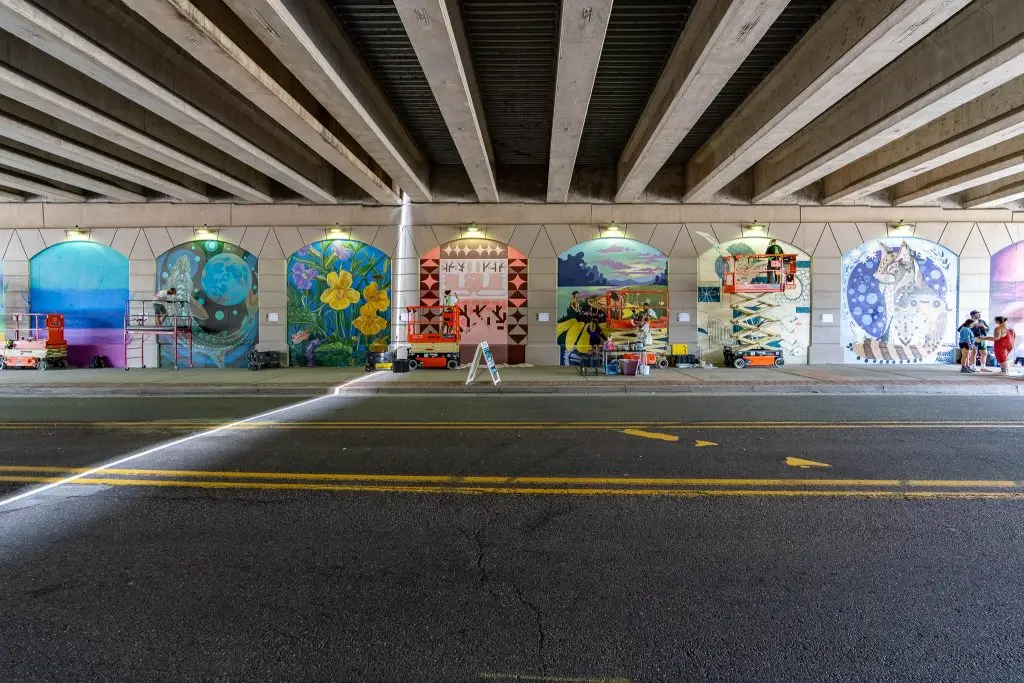 Painted during the inaugural Pleasant Peninsula Mural Festival in Grand Rapids, the collection can be found along the US-131 underpass near the Blue Bridge and the GVSU Eberhard Center.