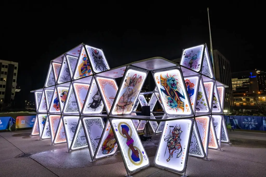 House of Cards was a multi-level light installation featuring 128 illuminated playing-card boxes. By day, it dazzled with sleek design and by night it became a dynamic light show. Each card was uniquely designed by international artists, including 10 West Michigan artists. The cards from these local artists traveled with the installation after its stop in Grand Rapids.
