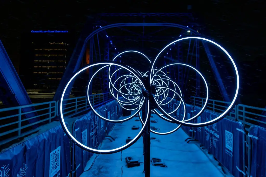 A throwback to the seeing-eye illusions of the 1960s, Kinetic Perspective was a spin-out. A row of 32 illuminated spinning circles, each moving in sync with another, the deceptively simple work played with perception as the circles continually disappeared and reappeared.