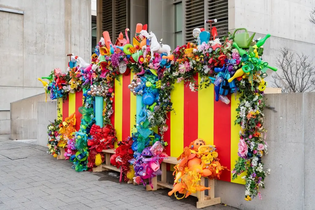 This installation featured everyday objects—shoes, birdhouses, old toys, silk flowers, lawn ornaments, and more, invoking ideas of home and personal memories. By day, viewers recognized familiar items that evoked a sense of cultural connection and belonging. By night, string lights, globes, and Christmas tree stars cast shadows across the environment, activating both the space and its visitors.