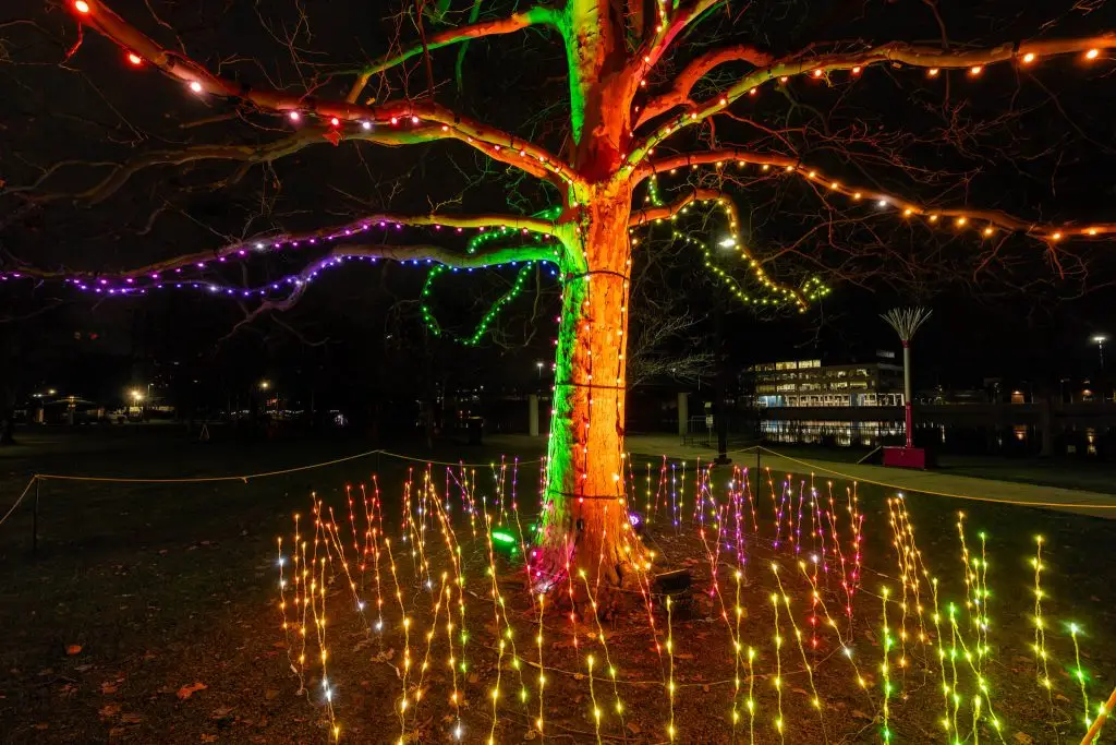 A towering tree in Sixth Street Park comes alive with hundreds of color-changing lights, creating a striking and dynamic display for visitors to enjoy.