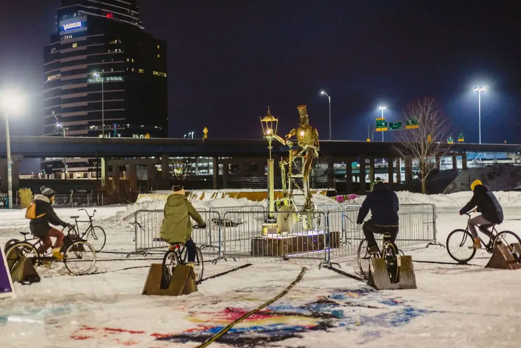 The Lamplighter sculpture featured a long-limbed lamplighter sitting atop a tall bike, illuminating the night as he lit a streetlamp. The Lamplighter was composed of hundreds of antiquated tools welded together in a grand gesture of gratitude to this humble worker of the past. Viewers were able to pedal stationary bikes that powered the lights of the sculpture, becoming part of the artwork in the process and connecting folks from all walks of life.