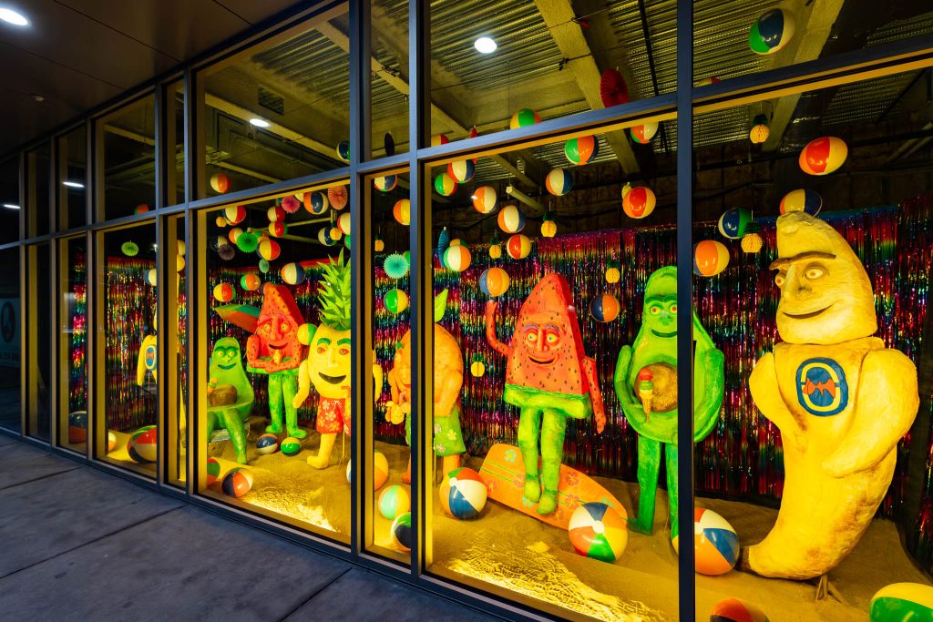 This large-scale, family-friendly paper mache installation offers a bright, tropical escape from the hum-drum nature of winter. This fun, vibrant and whimsical set depicts tropical fruits enjoying beach activities.